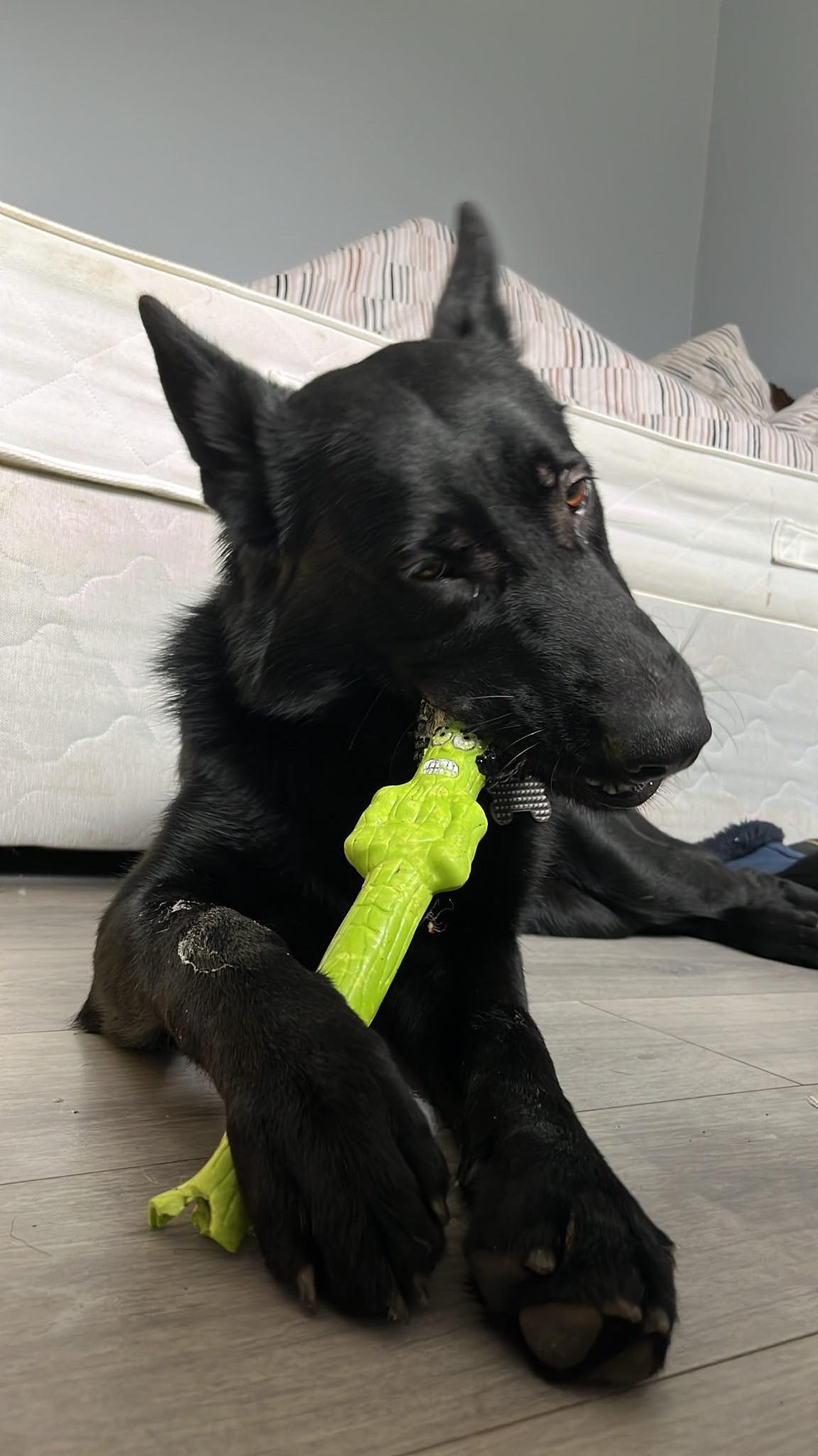 If your dog starts chewing something it’s not supposed to, it’s recommended you redirect them to their chew toy and once they start using that, reward them with a dog treat or praise. This will help them associate that toy with chewing.