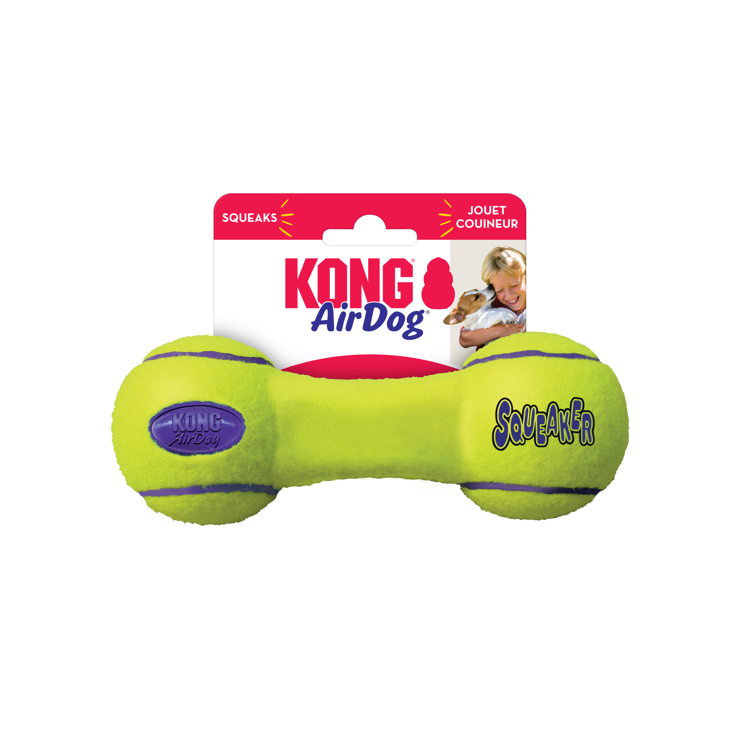 KONG AirDog® Squeaker Dumbbell combines two classic dog toys -the tennis ball and the squeaker - to create the perfect fetch toy. The non-abrasive, high-quality material will not wear down dogs’ teeth. Find your dog’s favorite AirDog® shape and let the games begin.