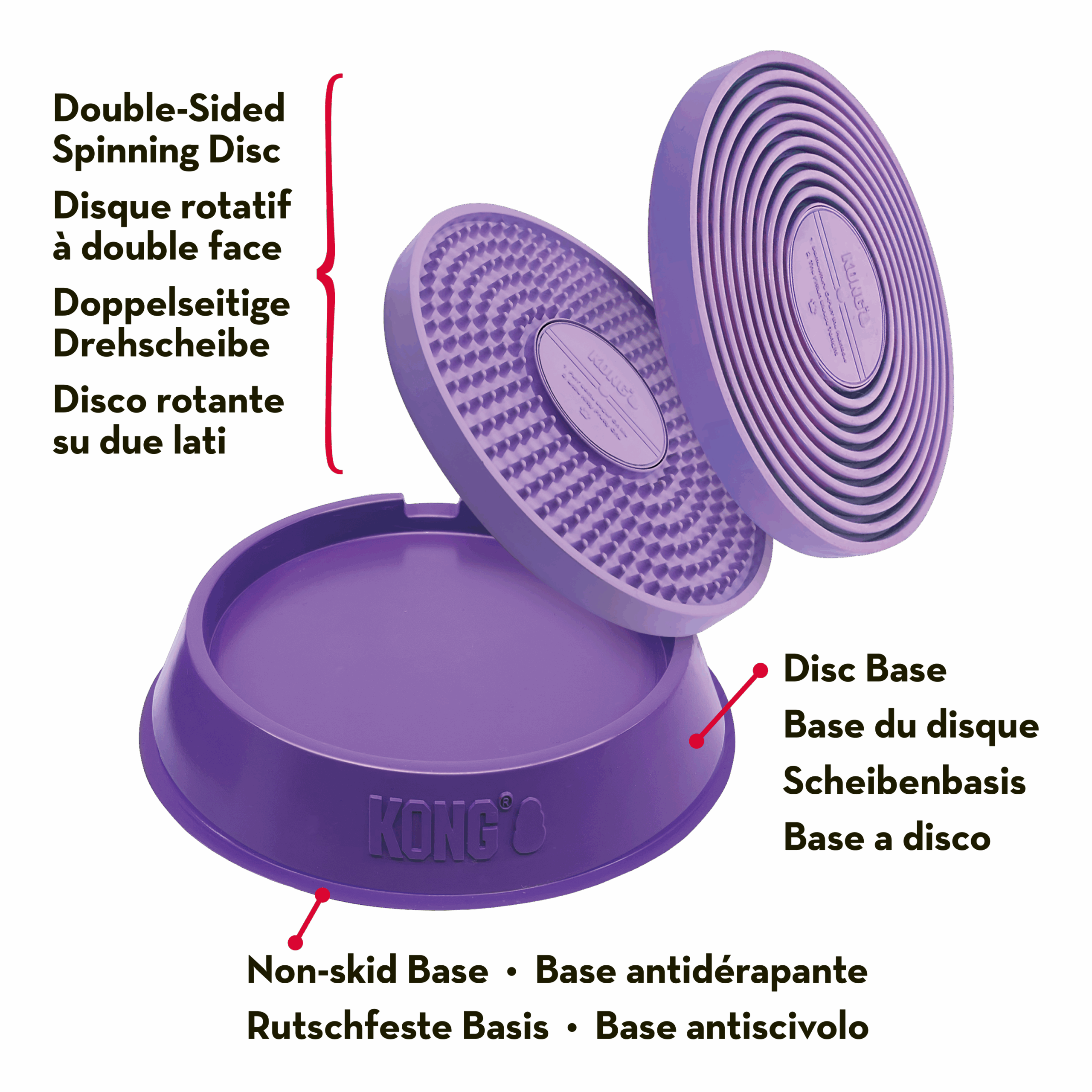 KONG Licks Spinz’ rotating, textured disc holds treats and yummy pastes, inviting your furry disc jockey to lick the treats as they spin the “record,” bringing challenge to the fun! Raised nubs help clean your pet’s tongue and support oral health, while easing stress and providing mental enrichment. The double-sided disc offers two textures for variety and can be removed for easy cleaning. The weighted, non-skid base keeps the feeder in place.